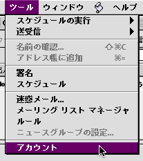 1. Outlook Express 5を起動し、ツールバーの[ツール]から、[アカウント]を選択しクリックします。