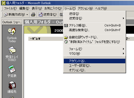 MicrosoftOutlookを起動して、メニューバーの[ツール]から[アカウント]を選択します。