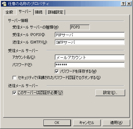[プロパティ]画面が表示されますので、[サーバー]タブを選択し、[このサーバーは認証が必要]にチェックを入れて[設定]ボタンをクリックします。