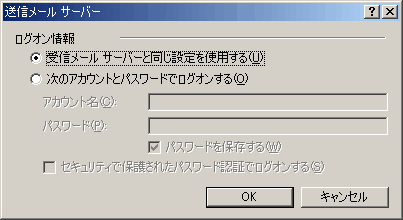 [送信メールサーバー]画面が表示されますので、[受信メールサーバーと同じ設定を使用する]にチェックを入れて[OK]ボタンをクリックします。