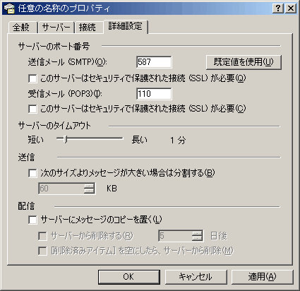 [詳細設定]タブを選択して、[送信メール(SMTP)]の値を"587"に変更して[OK]ボタンをクリックします。