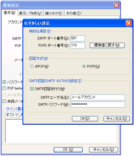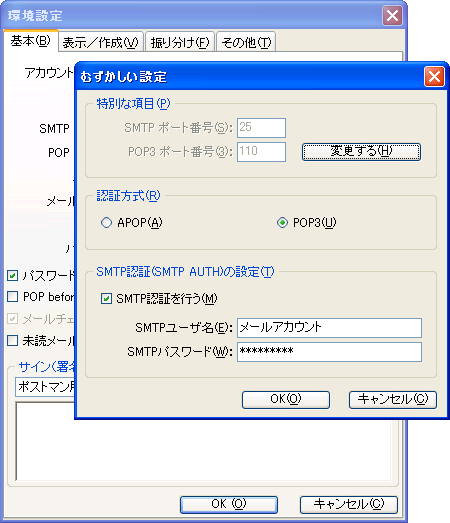 [むずかしい設定]画面が表示されますので、[SMTP認証を行う]にチェックを入れます。[SMTPユーザ名]にお客様のメールアカウントを、[SMTPパスワード]にメールパスワードをそれぞれ入力します。