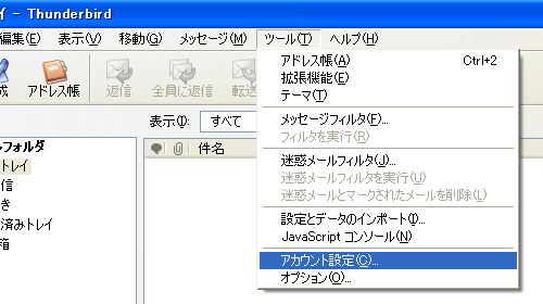 Thunderbirdを起動して、メニューバーの[ツール]から[アカウント設定]を選択します。