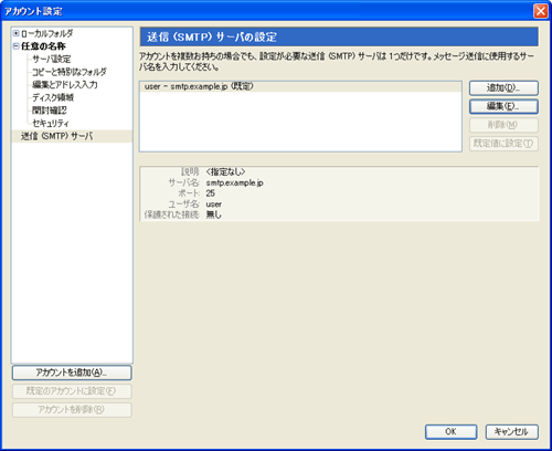 [アカウント設定]画面が表示されますので、[送信(SMTP)サーバ]をクリックします。右側の設定一覧から変更するアカウントを選択して、[編集]ボタンをクリックします。