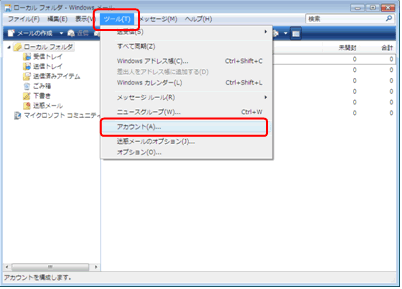 Windowsメールを起動して、メニューバーの[ツール]をクリックして[アカウント]を選択します。