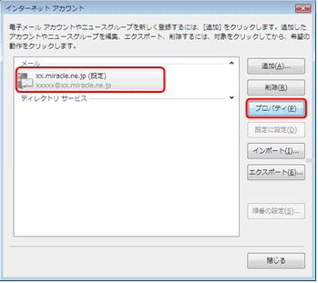 [インターネットアカウント]画面が表示されますので、ご利用のメールアカウントを選択して[プロパティ]ボタンをクリックします。