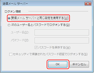 [受信メールサーバーと同じ設定を試用する]になっている事を確認し、[OK]ボタンをクリックします。