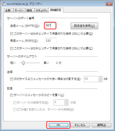 プロパティの画面で[詳細設定]タブを選択し、[送信メール(SMTP)]を「587」に変更し、[OK]をクリックします。